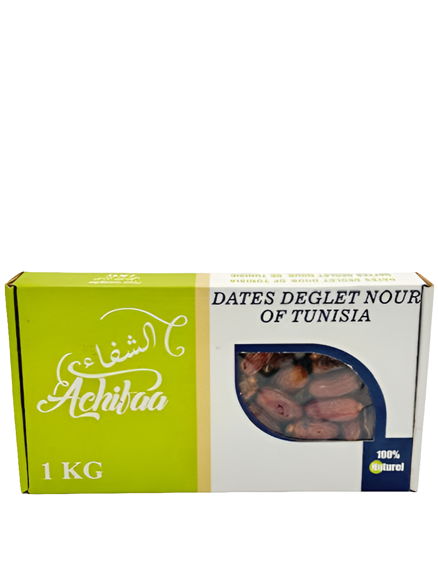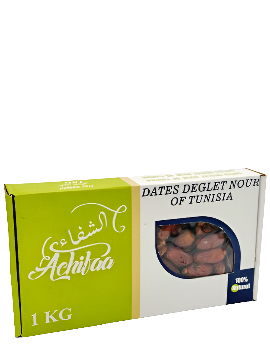 Genieße den einzigartigen Geschmack von Achifaa Deglet Nour Datteln – eine der edelsten und beliebtesten Dattelsorten aus Tunesien. Diese sonnenverwöhnten Datteln zeichnen sich durch ihre goldene, halbweiche Textur und ihren karamellartigen Geschmack aus.