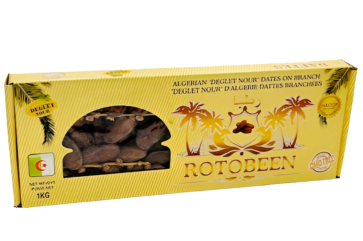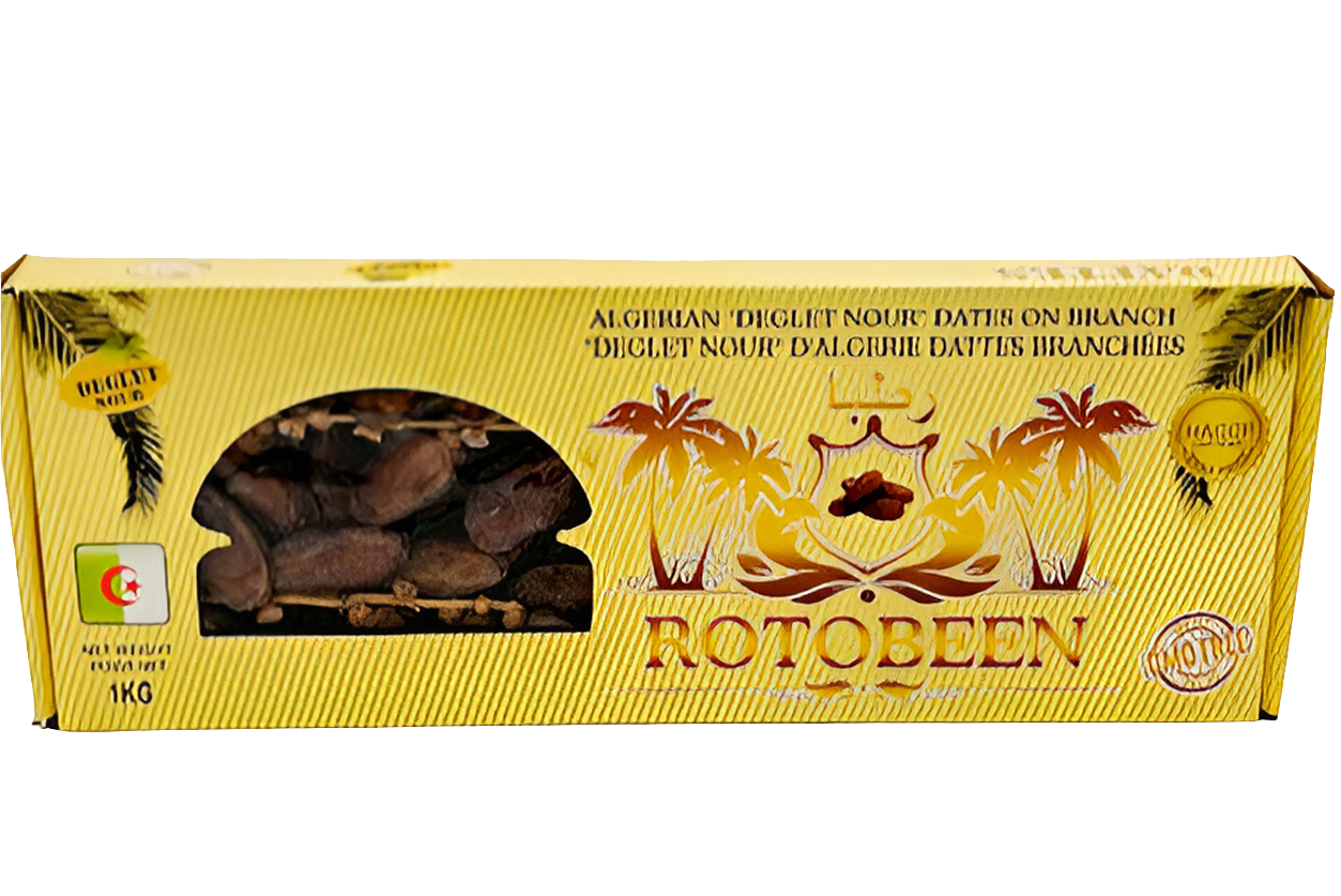 Erlebe den authentischen Geschmack von Rotobeen Deglet Nour Datteln am Zweig – handverlesene, sonnengereifte Datteln direkt von der Palme. Diese traditionelle Präsentation bewahrt die Frische und Qualität der berühmten Deglet Nour Datteln aus Algerien.